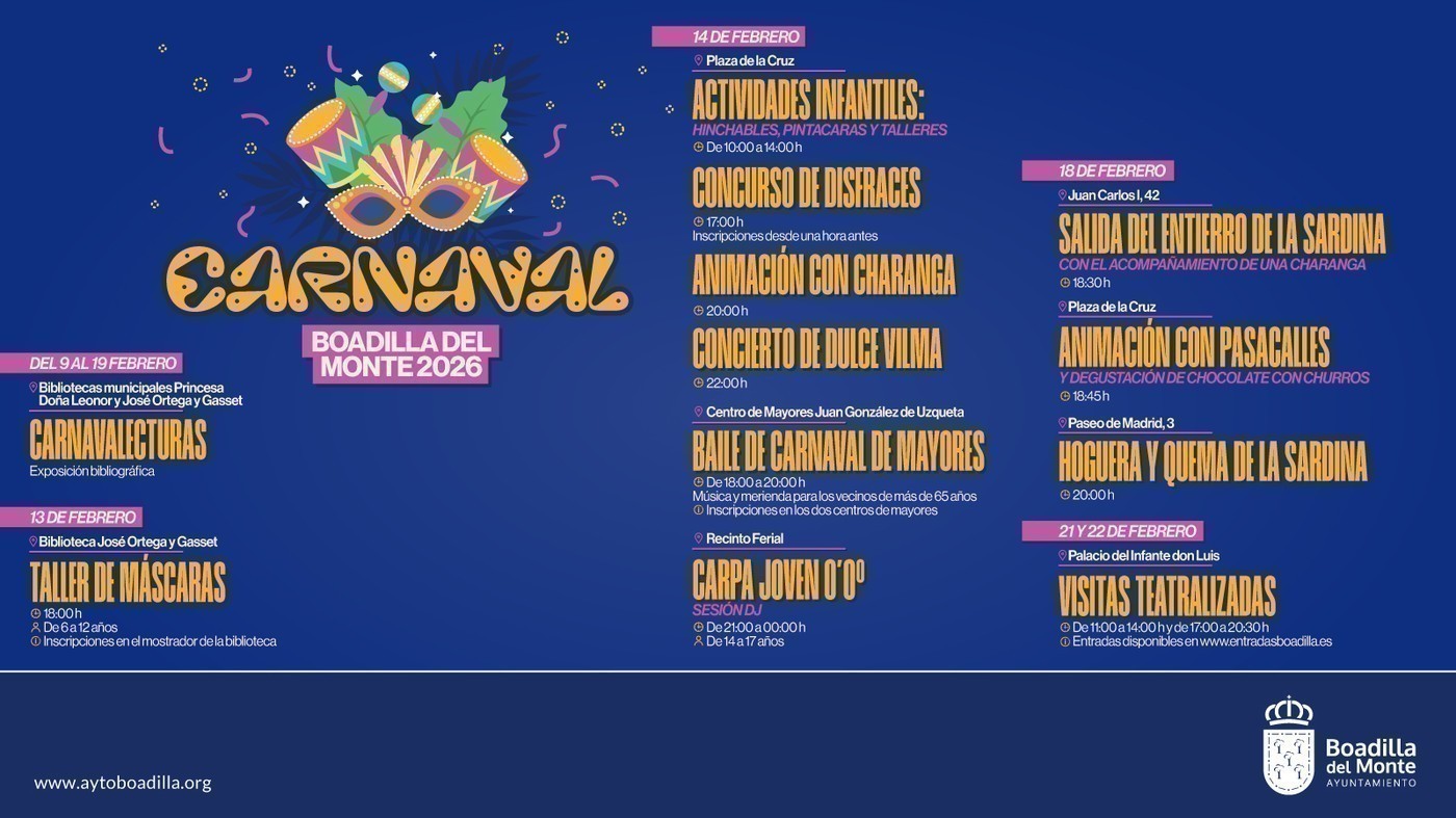 Redacción Boadilla IN - Boadilla del Monte celebrará el Carnaval a partir del próximo fin de semana con una programación abierta a todas las edades, que se prolongará hasta el 18 de febrero, fecha del tradicional Entierro de la Sardina. Talleres, concursos, conciertos y propuestas específicas para jóvenes y mayores marcarán unos días pensados para vivir la calle, compartir disfraces y cerrar el invierno con humor.